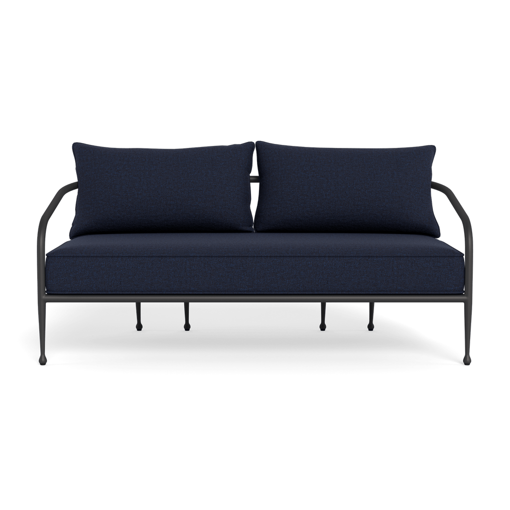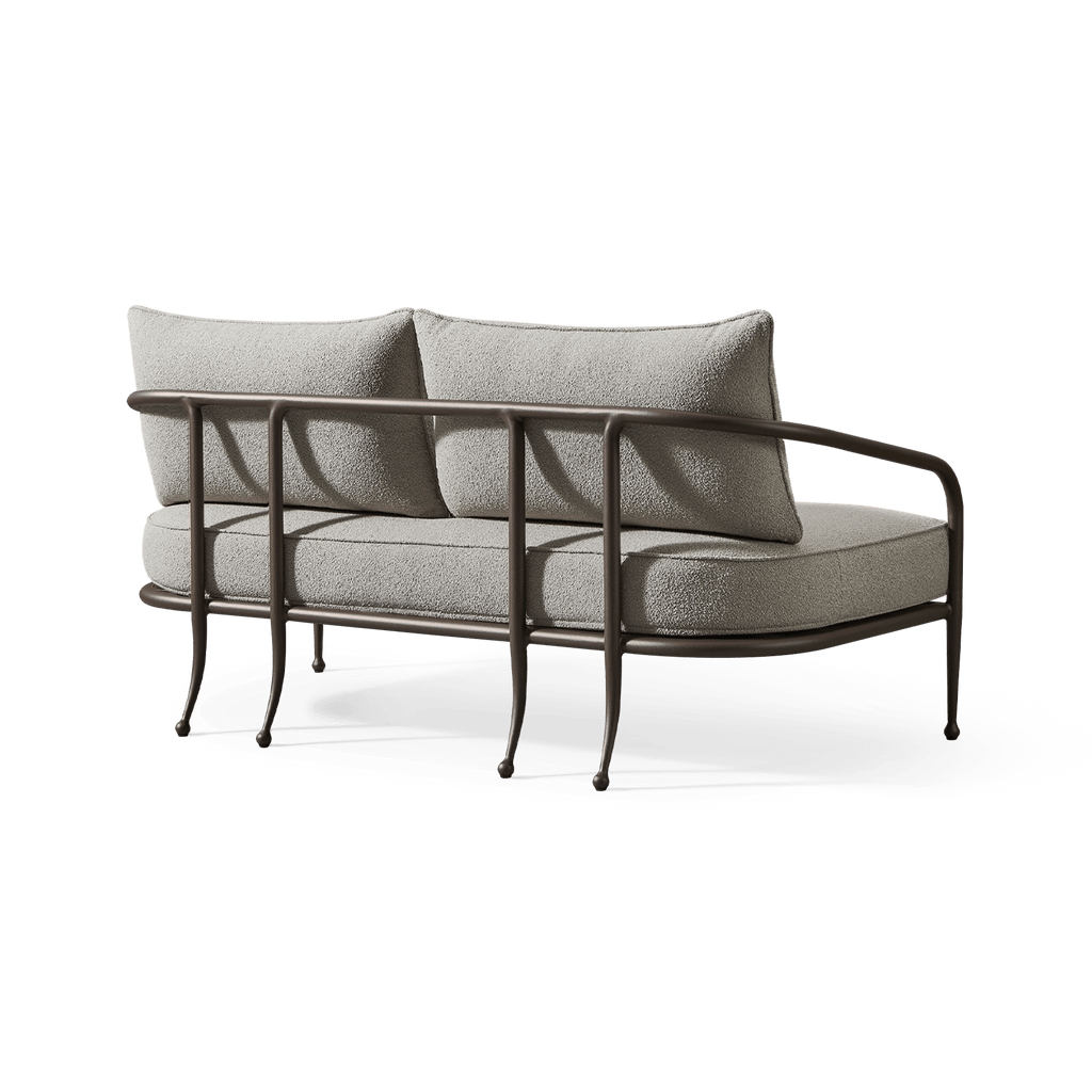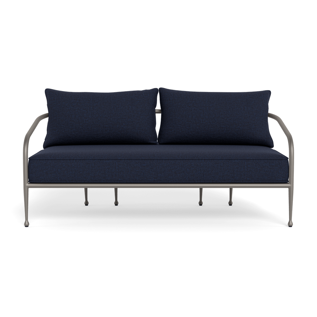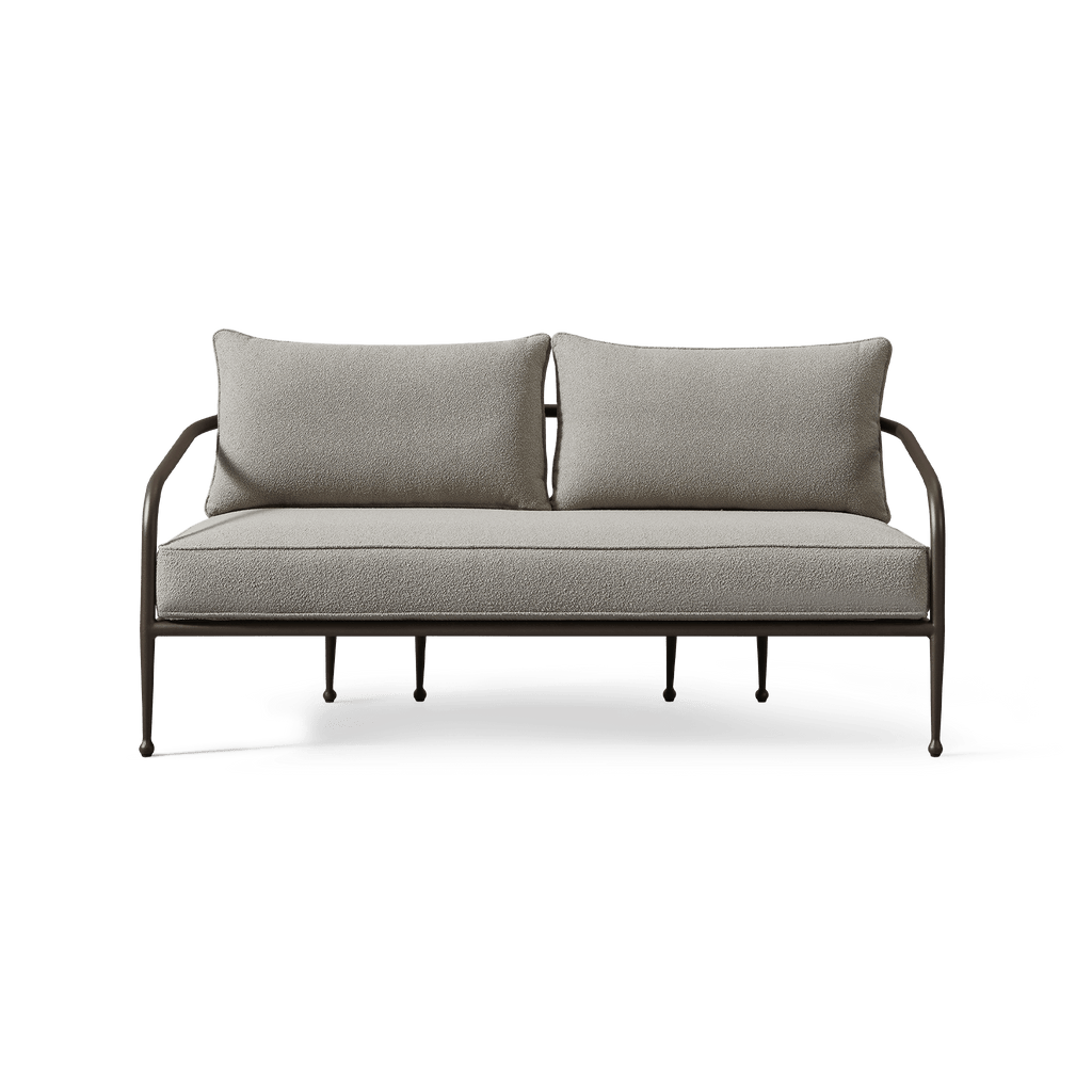 The Andre 2 Seat Sofa is inspired by classic wrought iron European furniture—enjoy a comfortable bench seat cushion with a pair of back pillows on our signature powder coated aluminum frame in a thinner style that creates an airy openness. The gradual slope and subtle curve of the frame add contemporary flair, while the back legs echo this effect with an equally subtle splay design. Details like ball feet and multiple rows of legs inject a contemporary, playful element. Petite in scale but grande in design, this outdoor sofa captures the look and feel of iron in an elegant construction that you might discover sitting in the garden of a five–star hotel in the South of France.