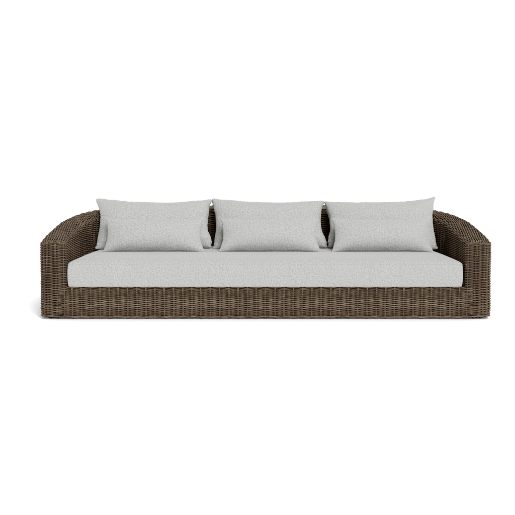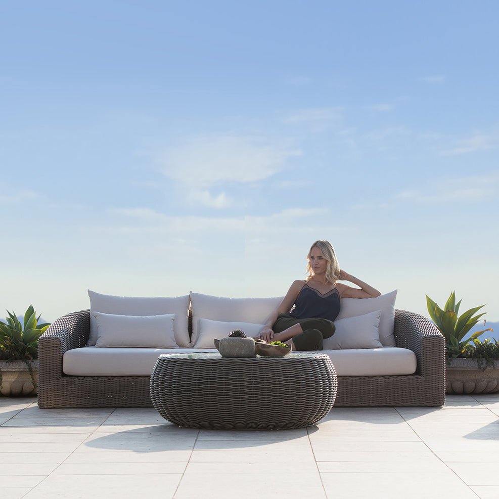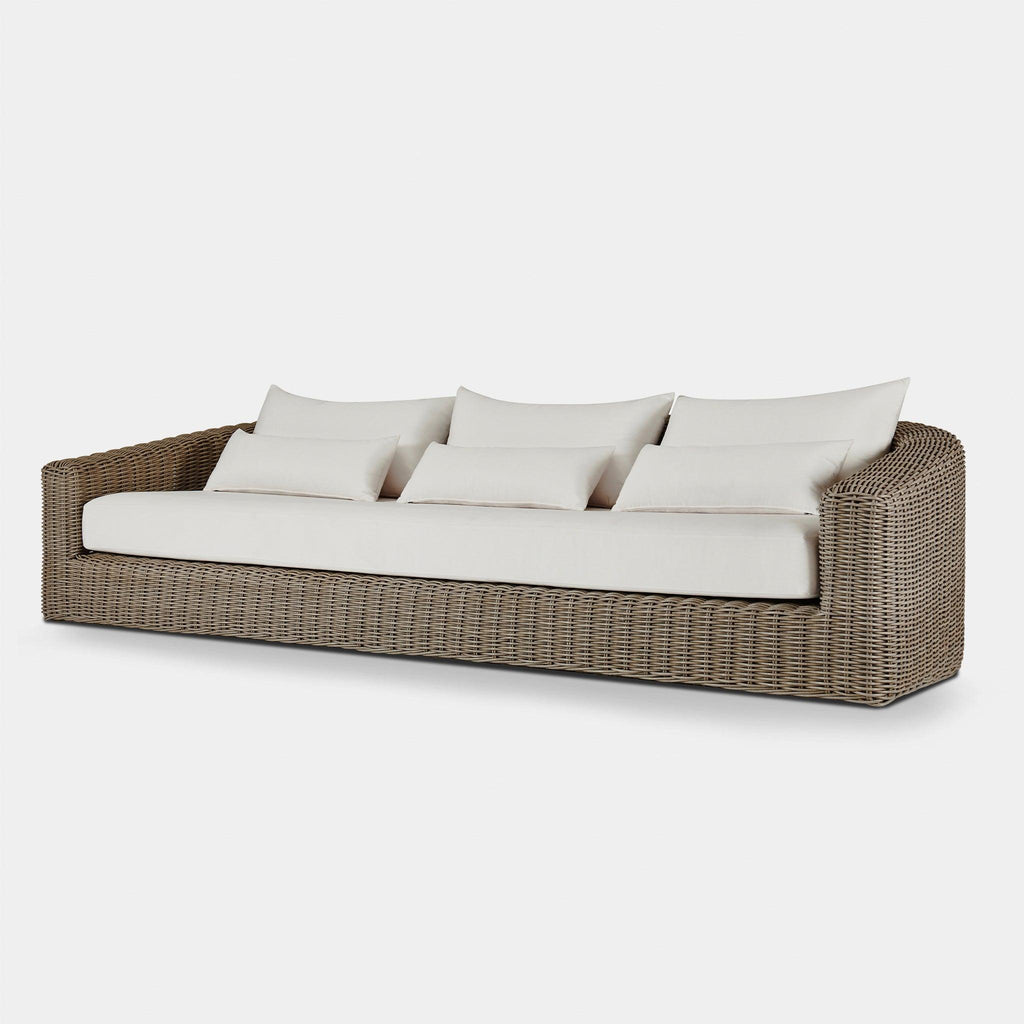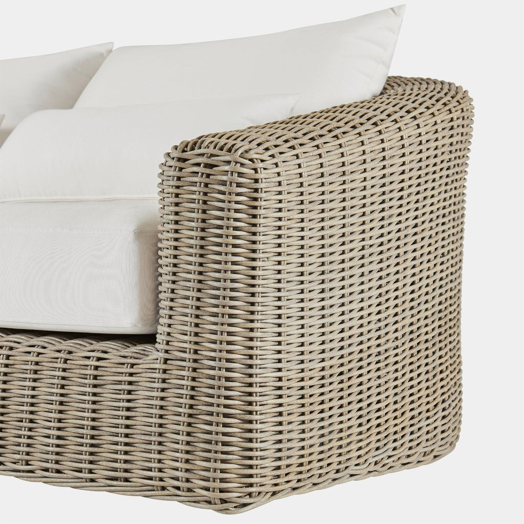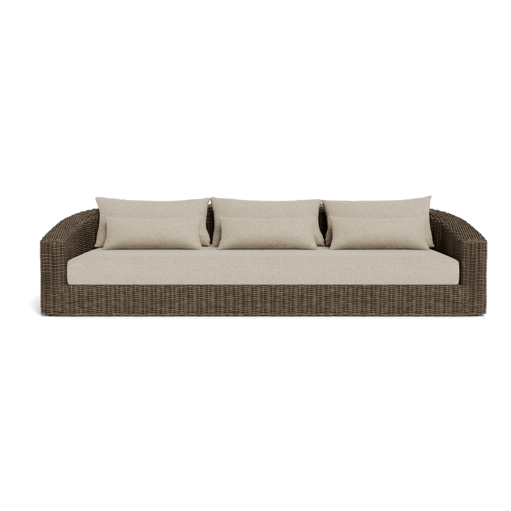 Our Barcelona collection reshapes traditional wicker into a transitional aesthetic. The Barcelona 3 Seat Sofa is an elegant update to classic wicker — enjoy a plush bench cushion with knife–edge back and lumbar cushions, all handcrafted from all–weather wicker woven on an aluminum frame. A gentle curved back defines and modernizes the collection. Offering a fresh take on a timeless material, this piece is the perfect update for any outdoor space.