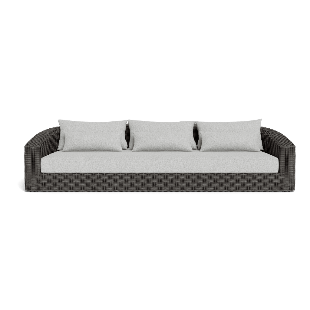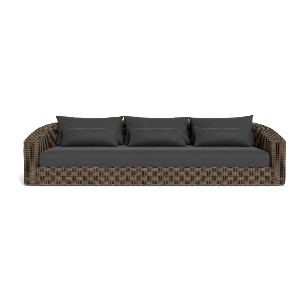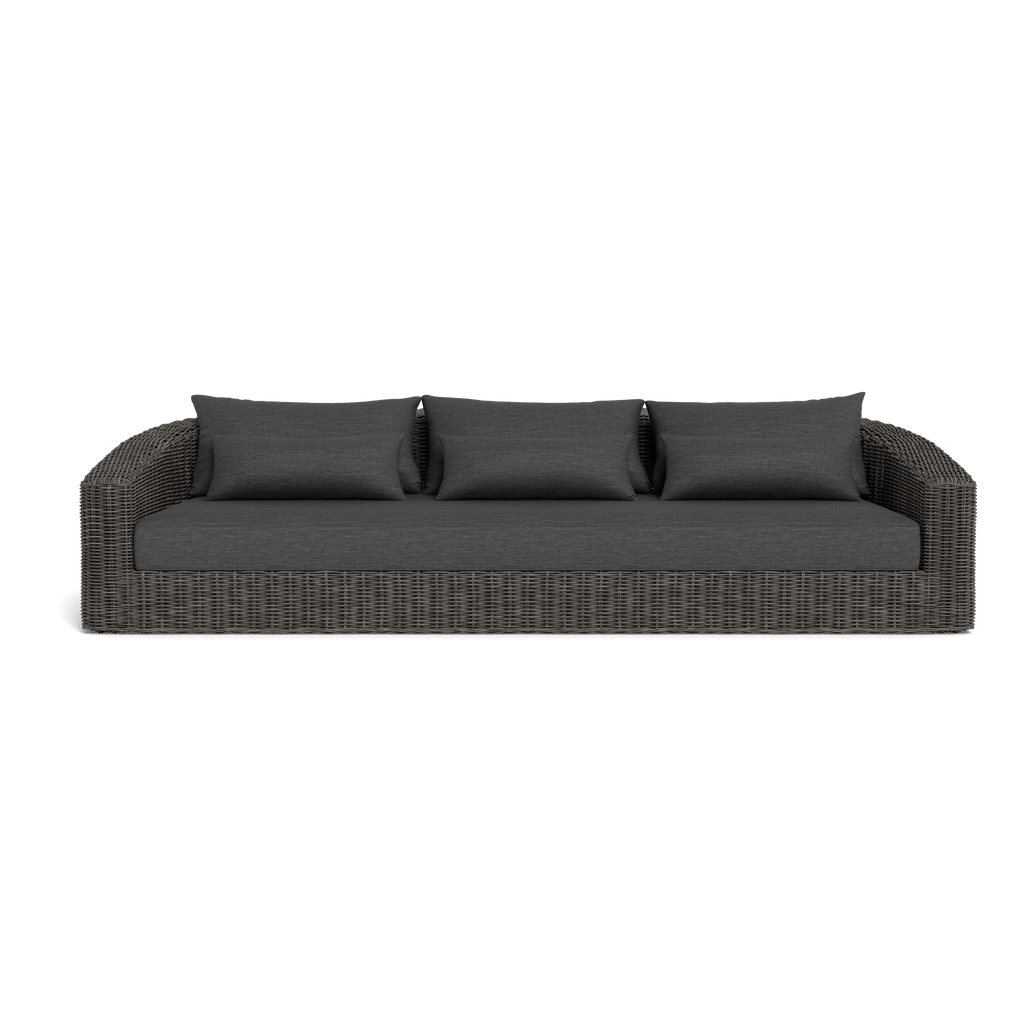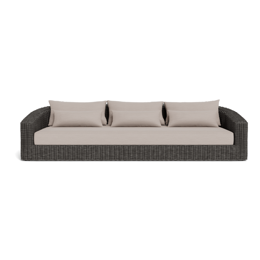 Our Barcelona collection reshapes traditional wicker into a transitional aesthetic. The Barcelona 3 Seat Sofa is an elegant update to classic wicker — enjoy a plush bench cushion with knife–edge back and lumbar cushions, all handcrafted from all–weather wicker woven on an aluminum frame. A gentle curved back defines and modernizes the collection. Offering a fresh take on a timeless material, this piece is the perfect update for any outdoor space.