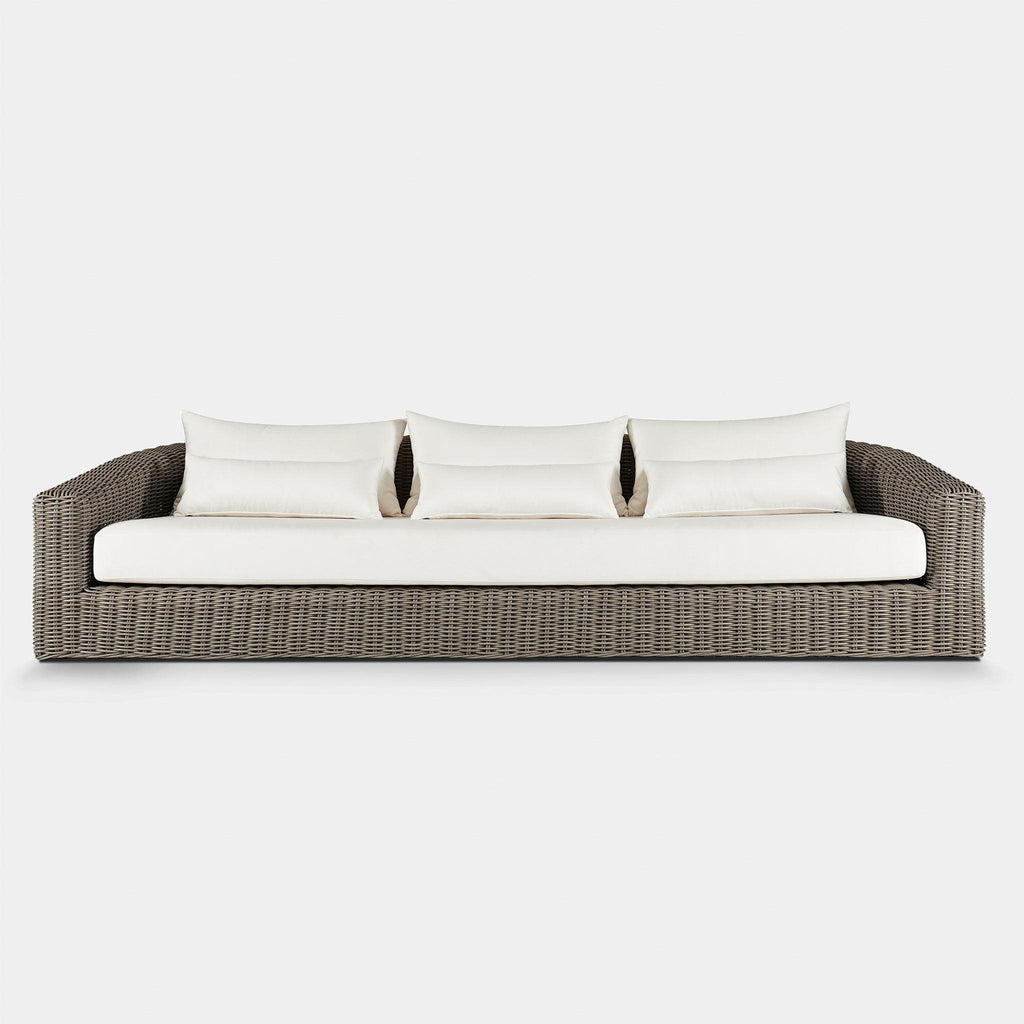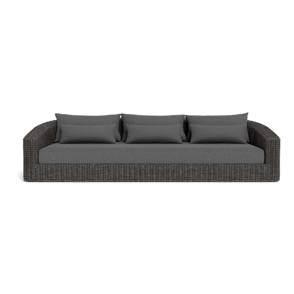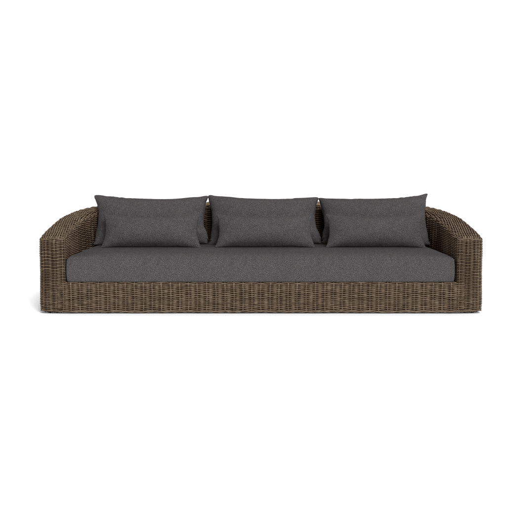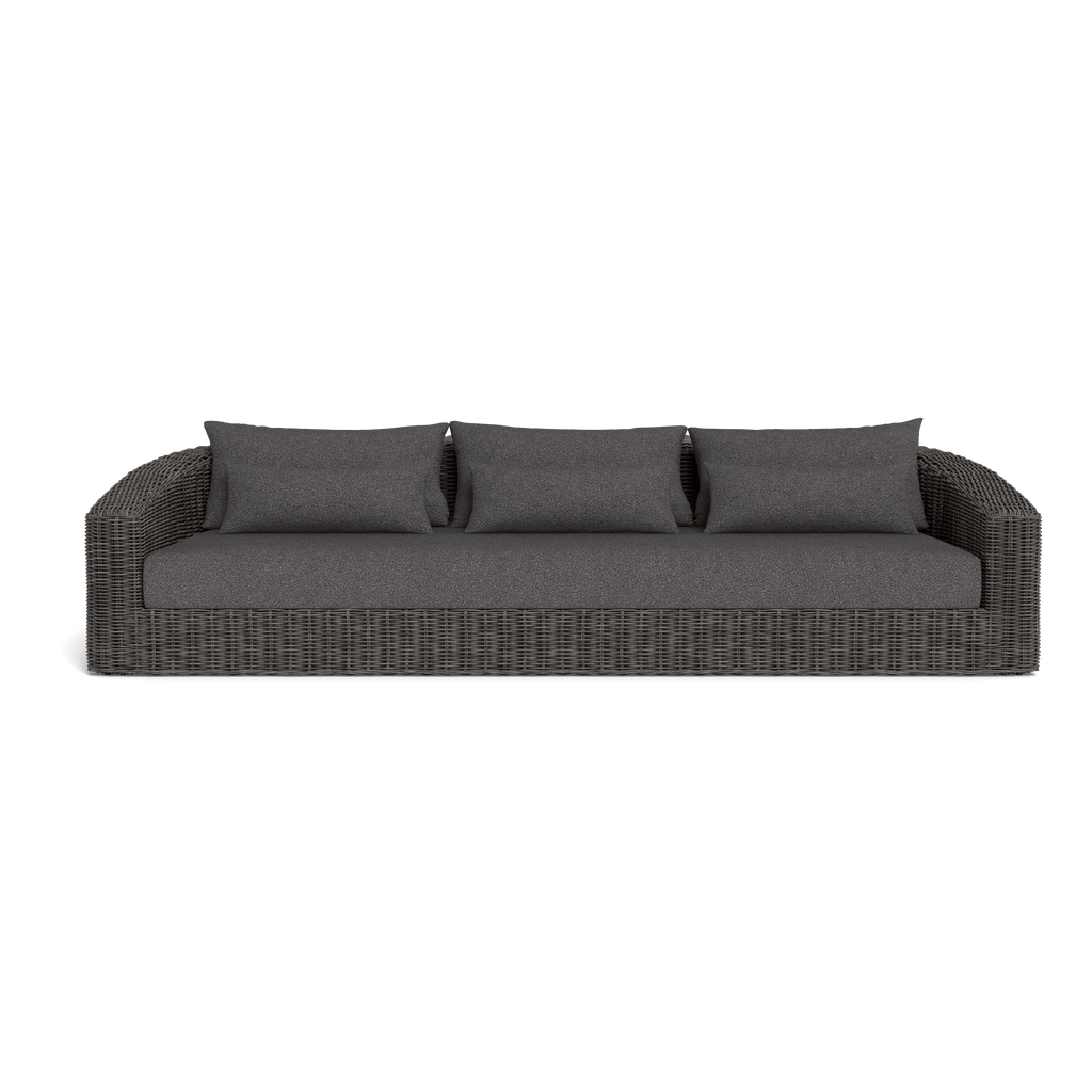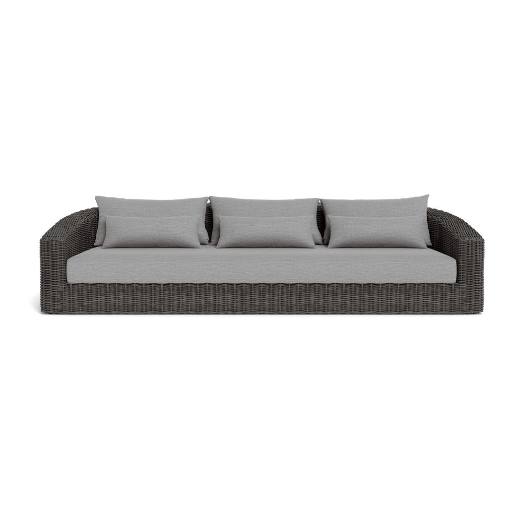 Our Barcelona collection reshapes traditional wicker into a transitional aesthetic. The Barcelona 3 Seat Sofa is an elegant update to classic wicker — enjoy a plush bench cushion with knife–edge back and lumbar cushions, all handcrafted from all–weather wicker woven on an aluminum frame. A gentle curved back defines and modernizes the collection. Offering a fresh take on a timeless material, this piece is the perfect update for any outdoor space.