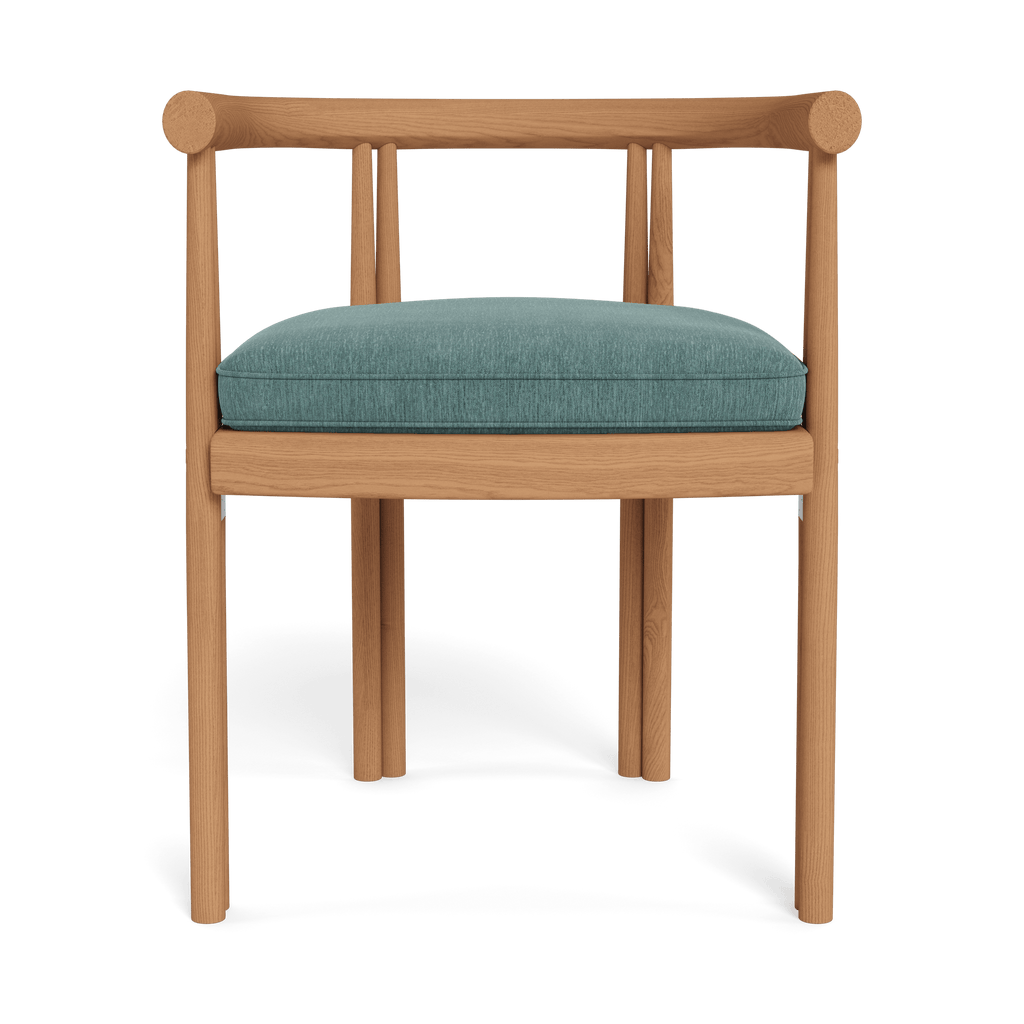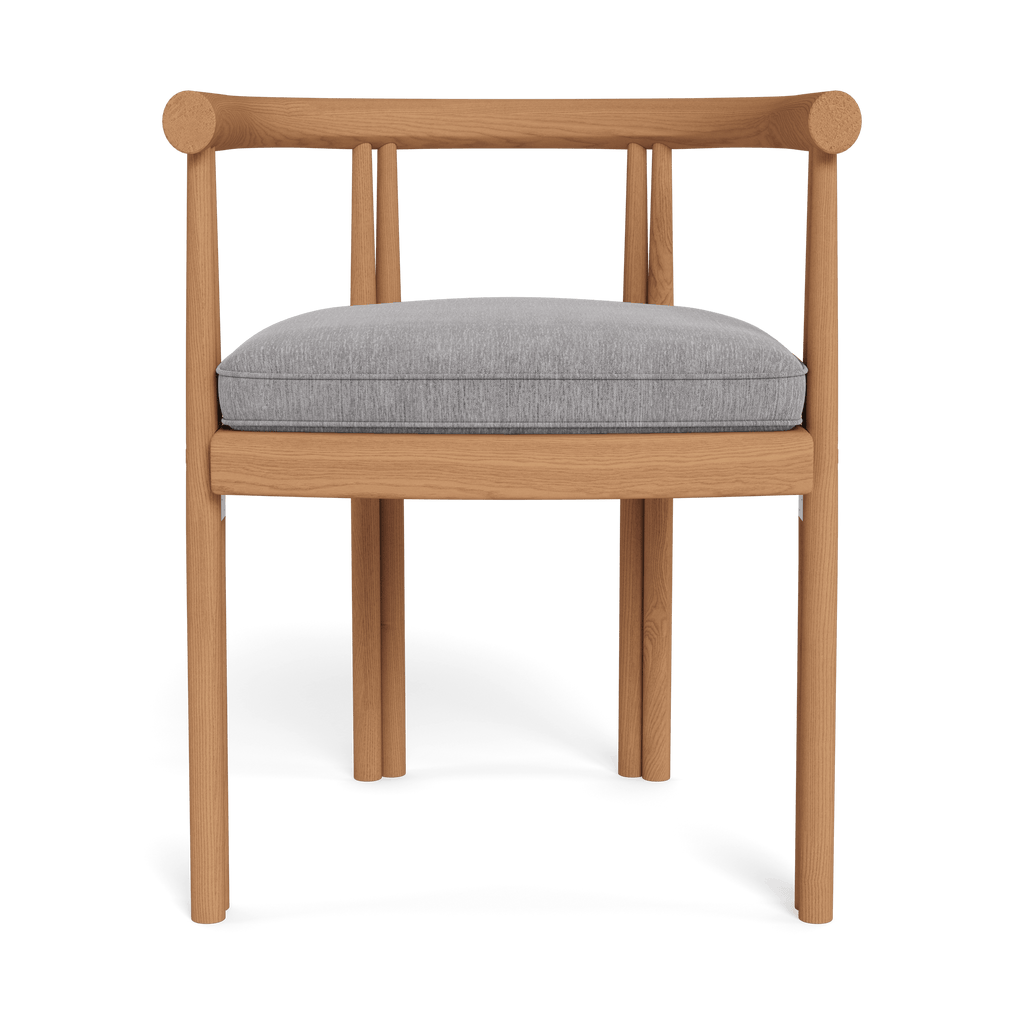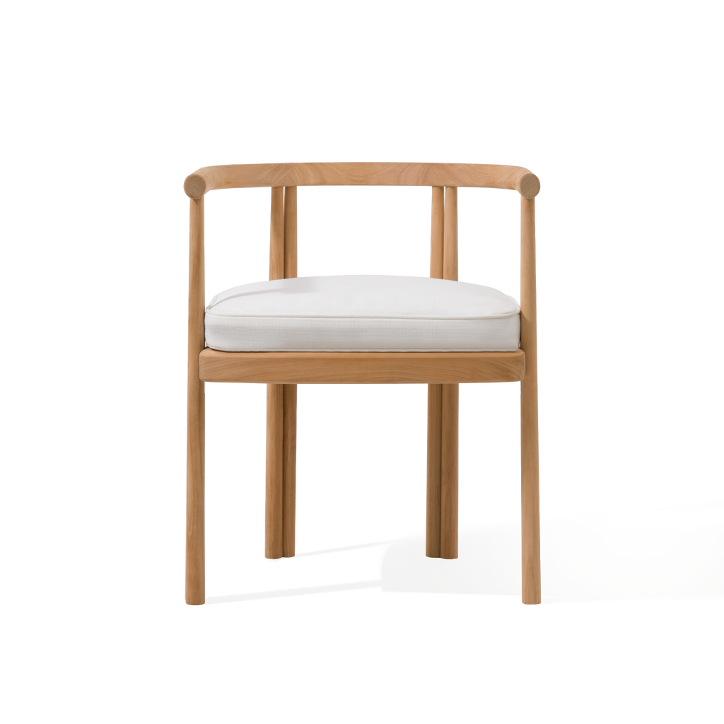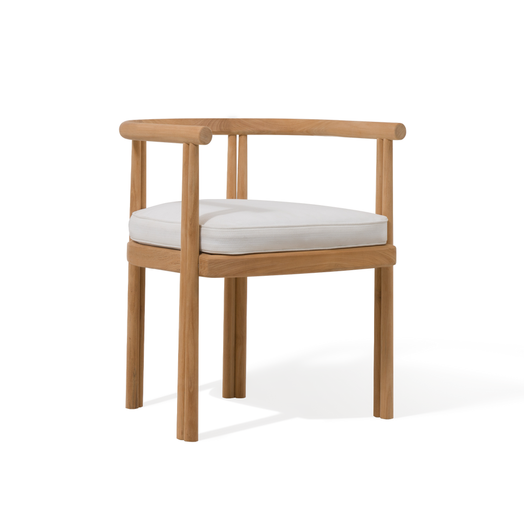 Influenced by modern Australian architecture and landscapes, our Cove Teak collection features considered details like double cylindrical legs and curved edges that create soft sculptural silhouettes. The Cove Teak Dining Chair is contemporary comfort, featuring a refined solid teak frame with an architectural double leg detail and striking curved back. Enjoy a plush all-weather cushion that invites sink-in comfort. This sculptural outdoor dining chair is a versatile design element for any space and effortlessly coordinates with the matching side chair. Pair it with any table to complete the outdoor dining set.