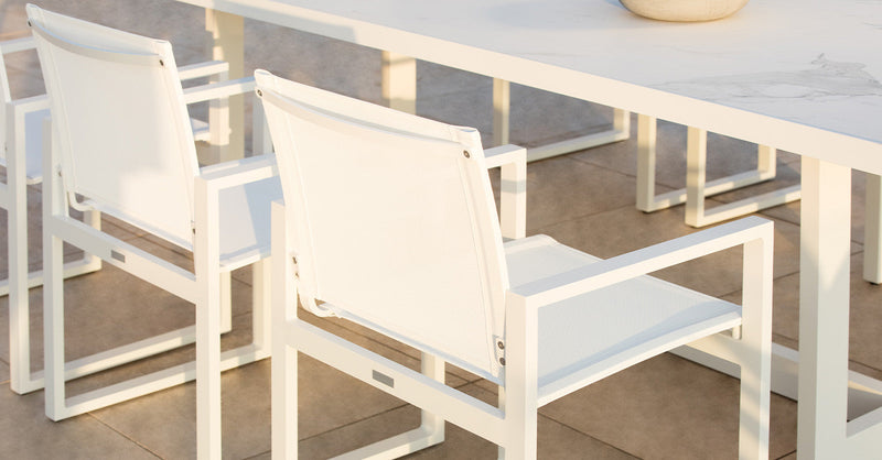 This collection feature top-of-the-line Batyline mesh slings – available in Silver – sourced and manufactured in Europe by Serge Ferrari. This incredibly strong PVC-coated material enables airy and supportive reclining and is resistant to stretching and tearing while being easy to clean.