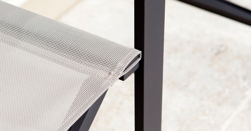 This collection feature top-of-the-line Batyline mesh slings – available in Silver – sourced and manufactured in Europe by Serge Ferrari. This incredibly strong PVC-coated material enables airy and supportive reclining and is resistant to stretching and tearing while being easy to clean.