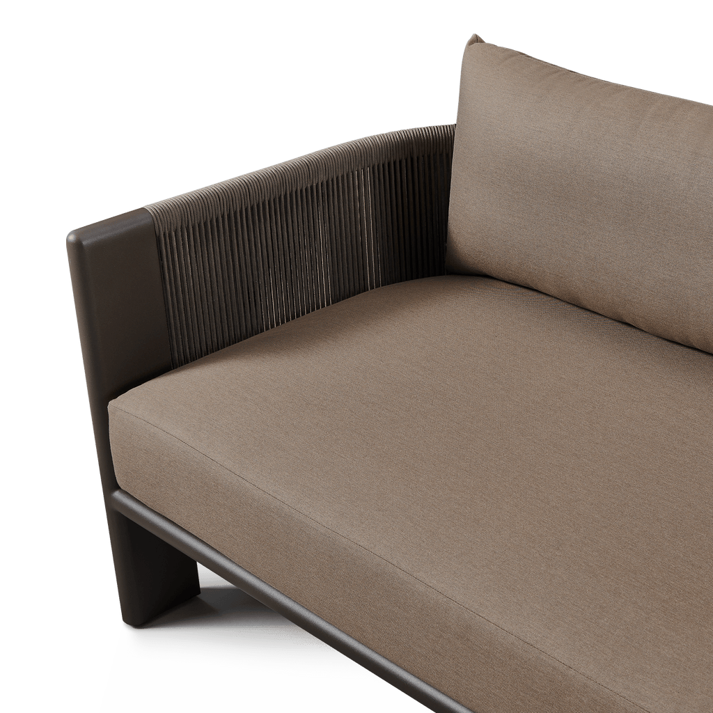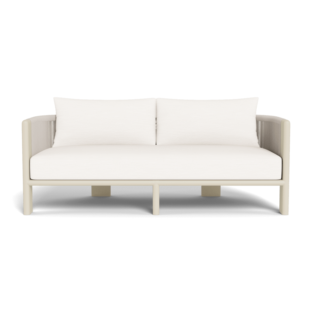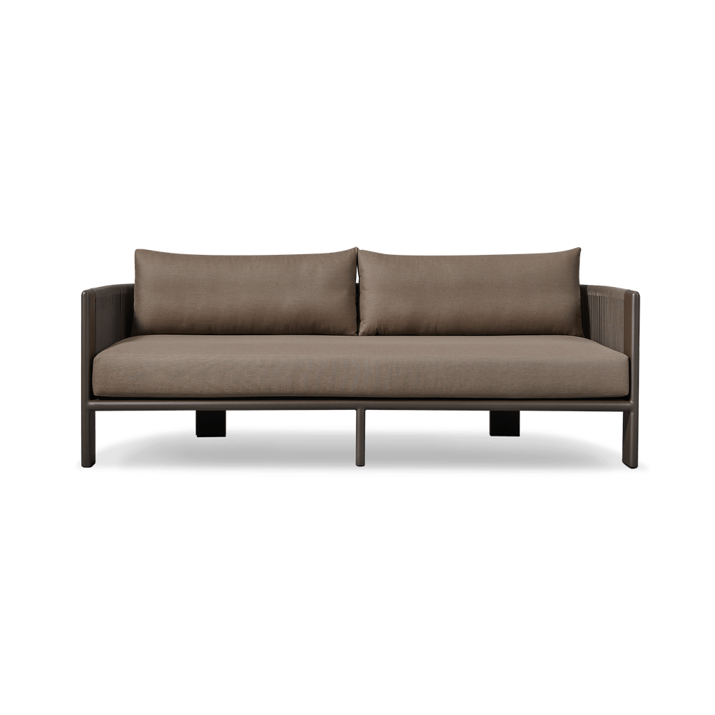 A nod to Sydney’s iconic Palm Beach with its stately coastal pines. Rounded backs, vertical rope detailing and a harmonious mix of materials infuse classic silhouettes with modern elegance. Transitional in spirit, the Palm Beach Aluminum 3 Seat Sofa is a refreshing update to our signature classics—enjoy a luxuriously low bench seat cushion with a pair of knife–edge back pillows on a supportive slatted suspension in the just–released colorway of Stone. The powder coated extruded aluminum frame features vertically woven all–weather rope and plays with materials and form. In the back, two legs disrupt this rope pattern and echo the tripod construction of the collection’s chairs. Available in two versatile sizes, this comfort–driven piece seamlessly blends with many styles and in many outdoor spaces.