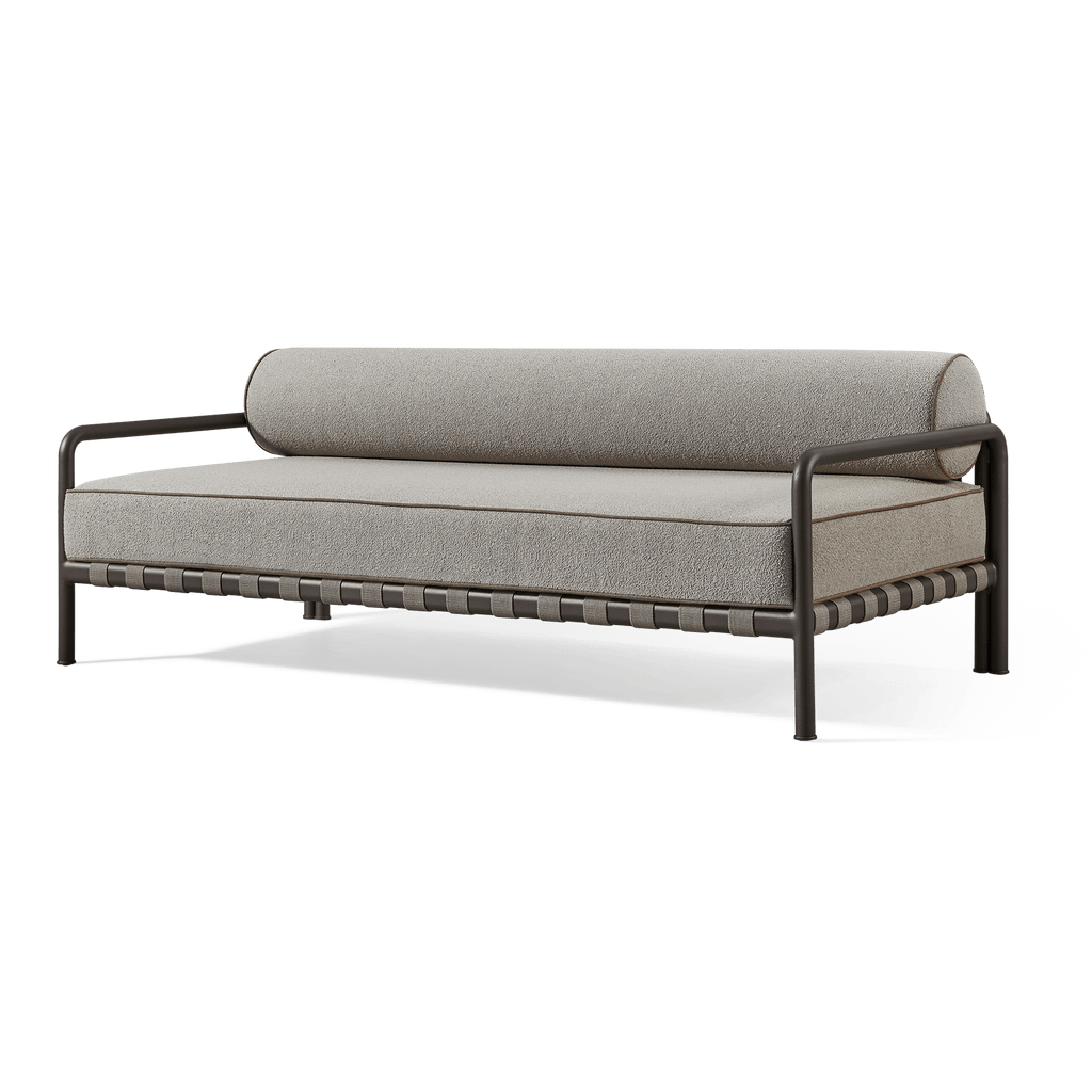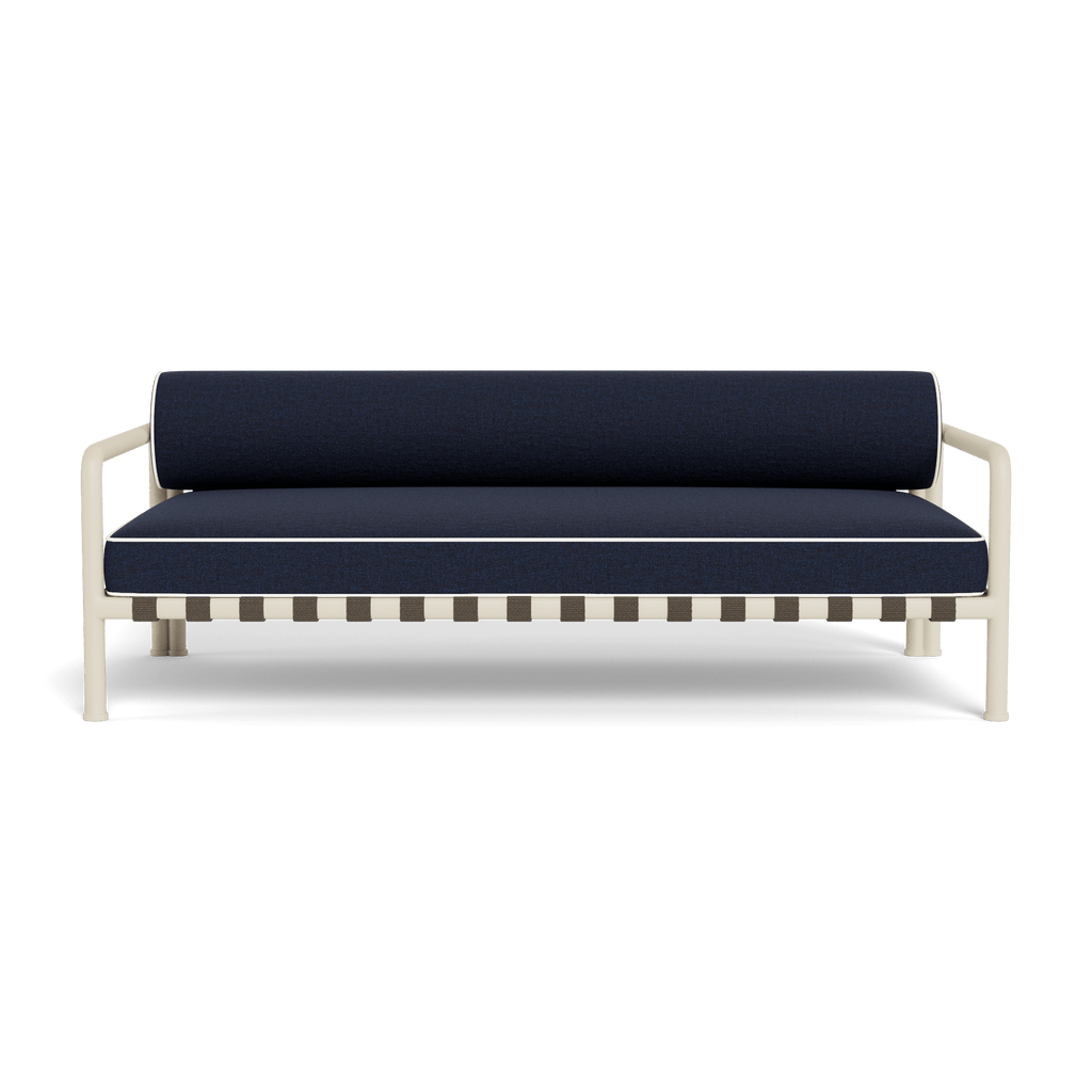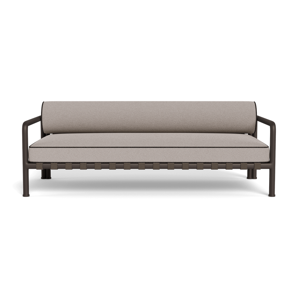 Tubular bronze aluminum, thick strapping and refined piping effortlessly update mid–century charm with contemporary sophistication for any outdoor space. The Parker 2 Seat Sofa is a bold design statement—enjoy a comfort–driven bench cushion and bolster back, supported by a tubular metal frame and high–quality strapping woven in parallel lines in both directions for added interest as it’s spotted through the seat deck or back. Details like contrast piping and a subtle shape placed at the foot complete this design–forward low seating collection. A gorgeous and intricately crafted piece, this outdoor sofa brings a touch of tradition into modern day. Available in two sizes.